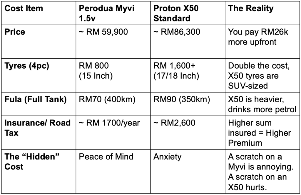 - That means you drive a used Myvi or a new Axia. Not an X50.